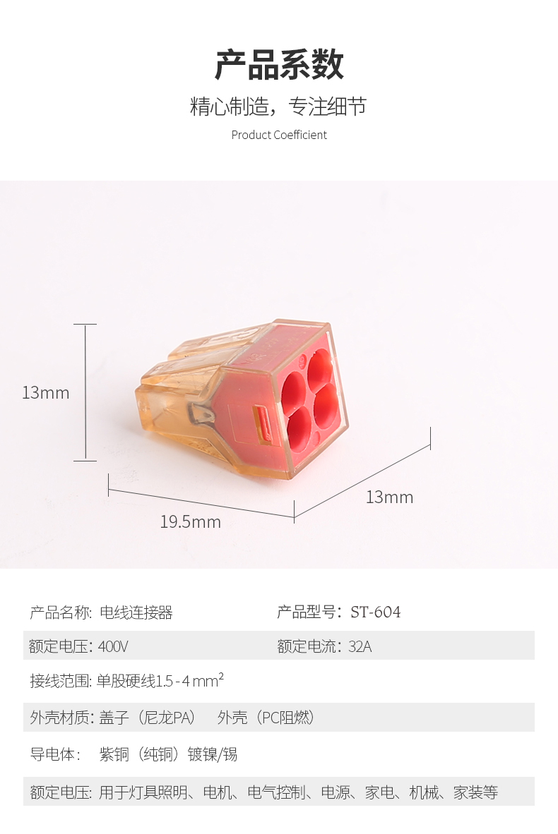 額定電流:400A額定電流:32A導(dǎo)線線徑:1.5-4mm²耐電壓:AC2500V/1Min機(jī)械性能環(huán)境溫度:-40°C~+105°C剝線長度:12mm尺寸:19.5*,9.2*,13.1材質(zhì)及電鍍塑件:PC,UL94V-2彈片:不銹鋼觸點材料:電解銅鍍鎳錫
