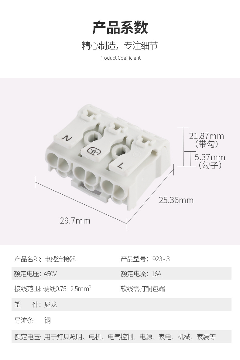 產(chǎn)品名稱:923接線端子3P產(chǎn)品型號(hào):923-3P適用導(dǎo)線:軟硬導(dǎo)線 0.75-2.5mm^2技術(shù)參數(shù):額定電壓 450V 額定電流 24A產(chǎn)品尺寸:30*25*21mm(長(zhǎng)*寬*高)產(chǎn)品材料:外殼 改性尼龍PA66 導(dǎo)流條 電解銅(表面鍍錫) 彈片 301不銹鋼